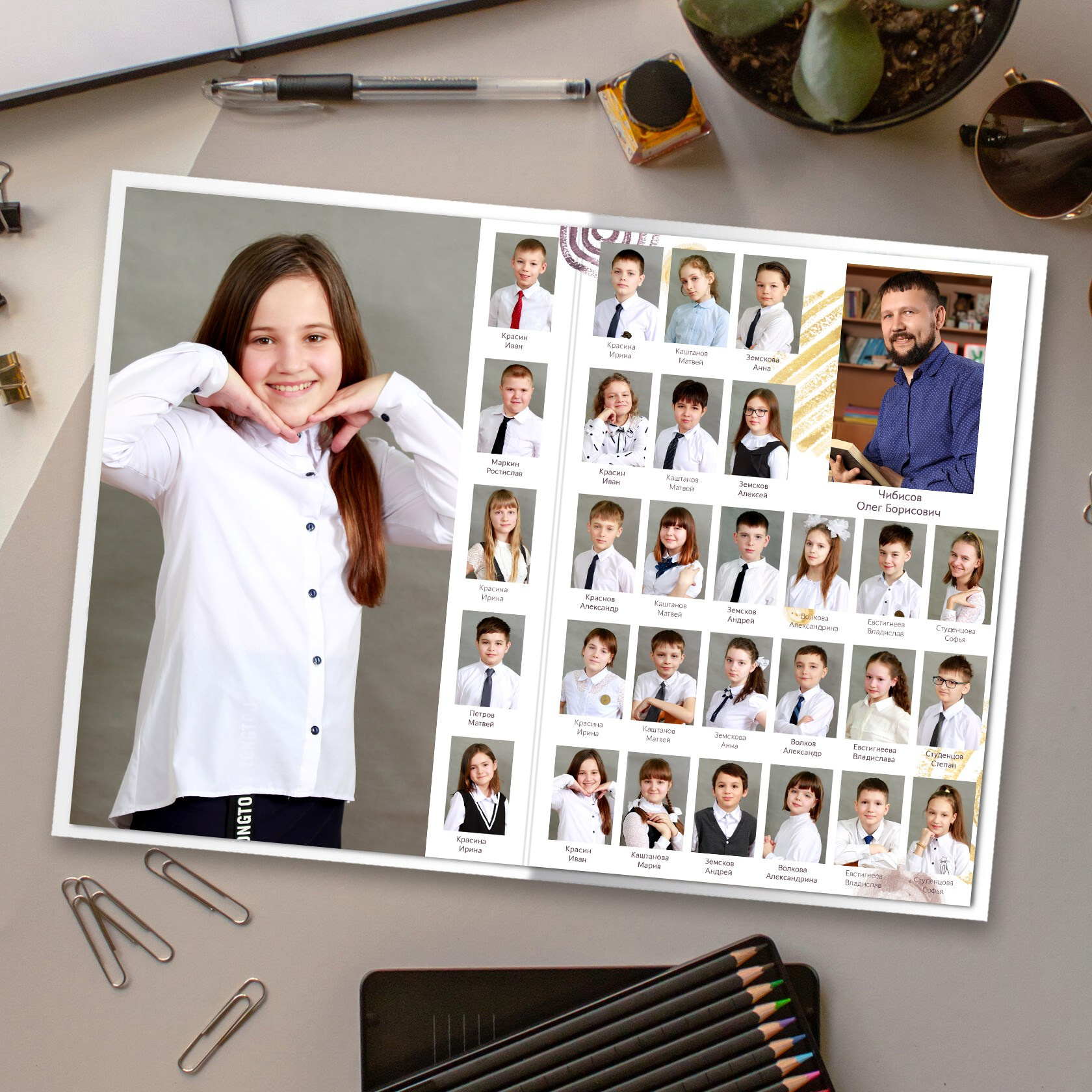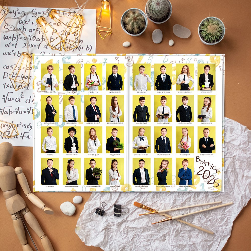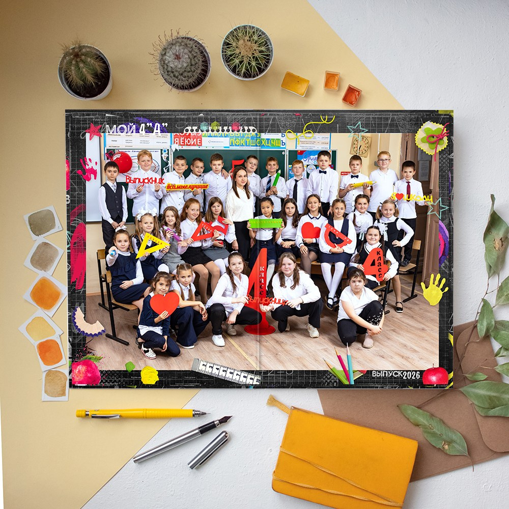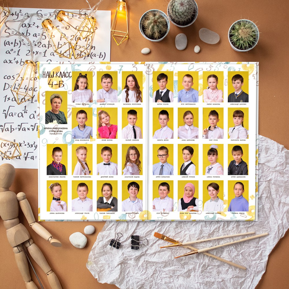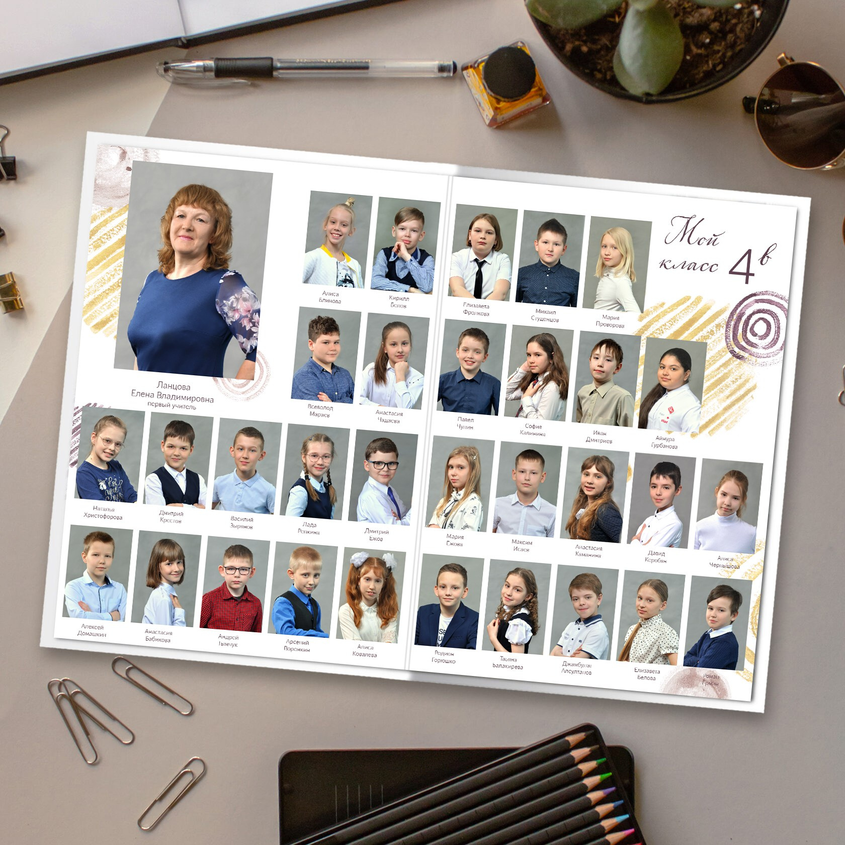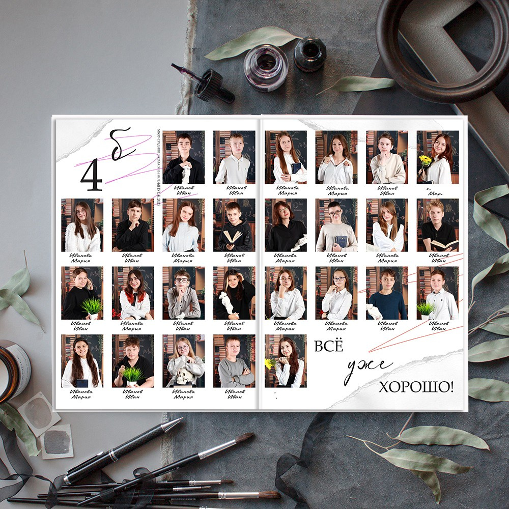- Альбом ОБЩЕЙ ВЁРСТКИ, с одним персональным портретом для каждого ученика (портрет дублируется в виньетку). Остальное наполнение общее для всего класса