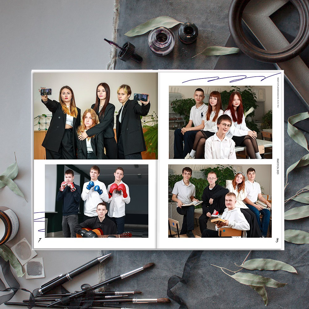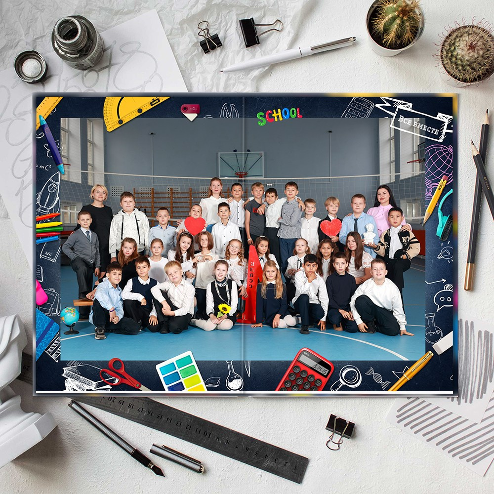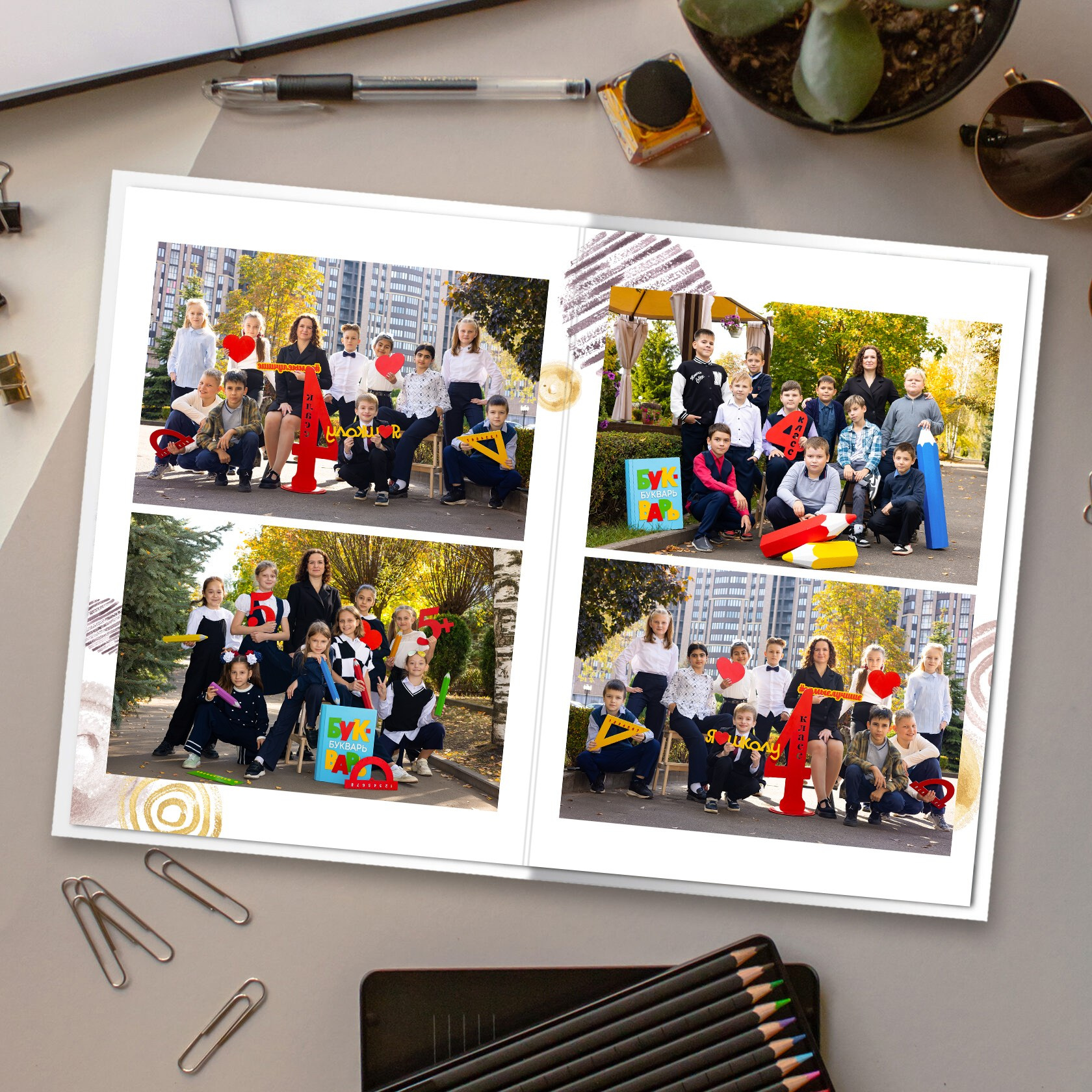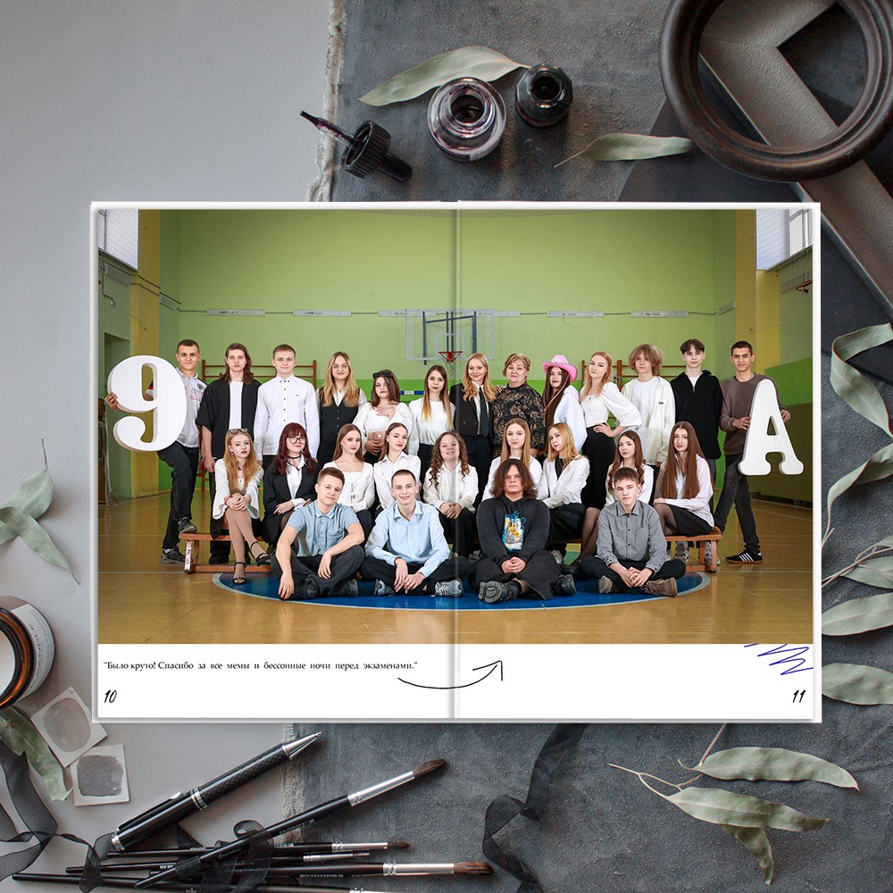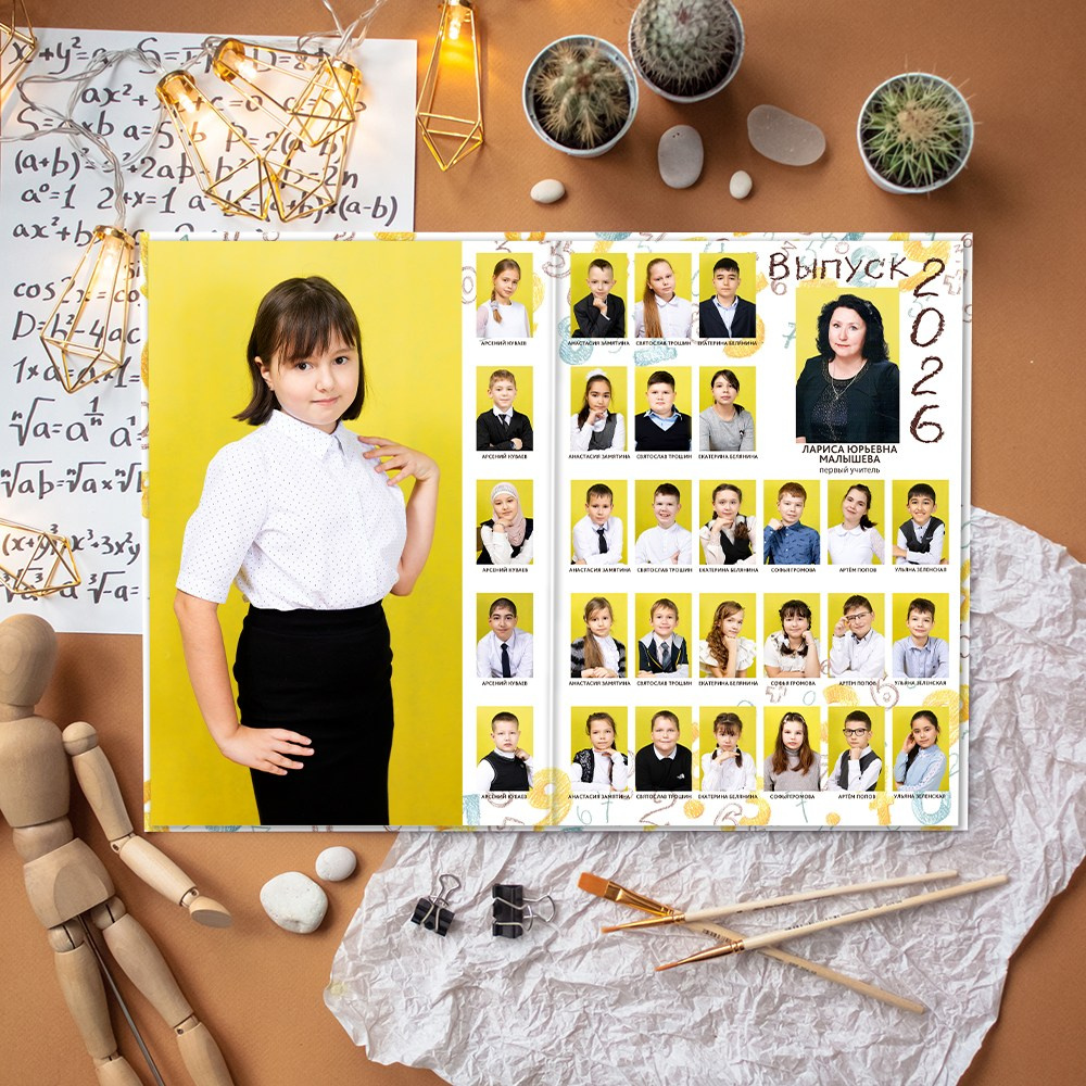 - Альбом ОБЩЕЙ ВЁРСТКИ, с одним персональным портретом для каждого ученика (портрет дублируется в виньетку). Остальное наполнение общее для всего класса