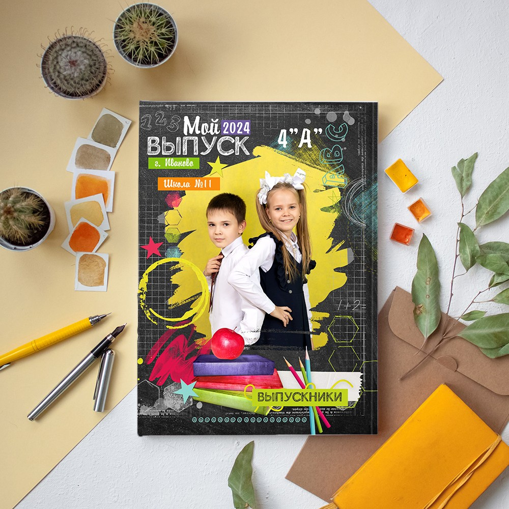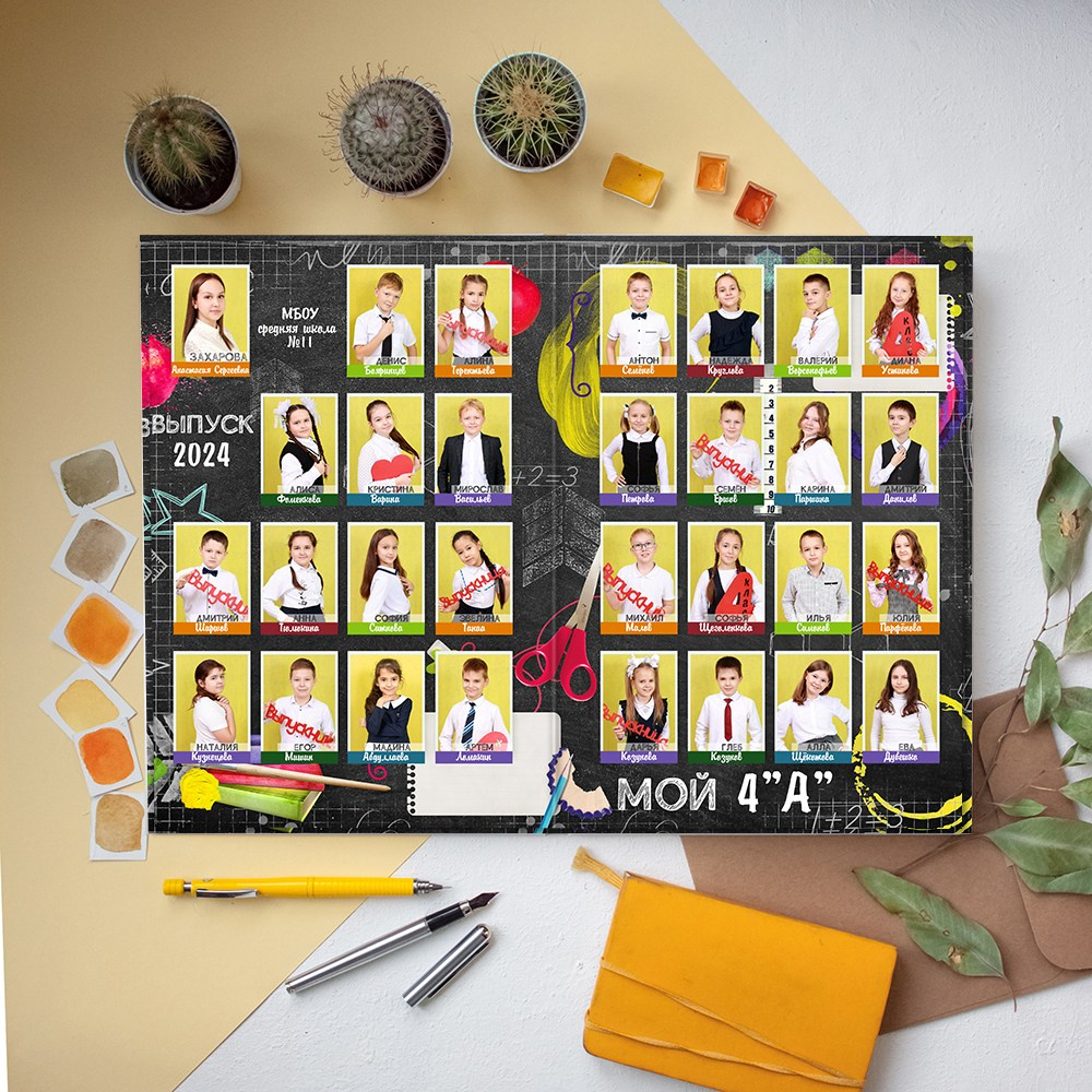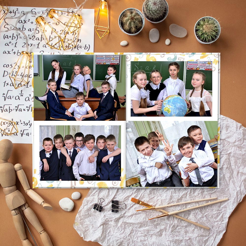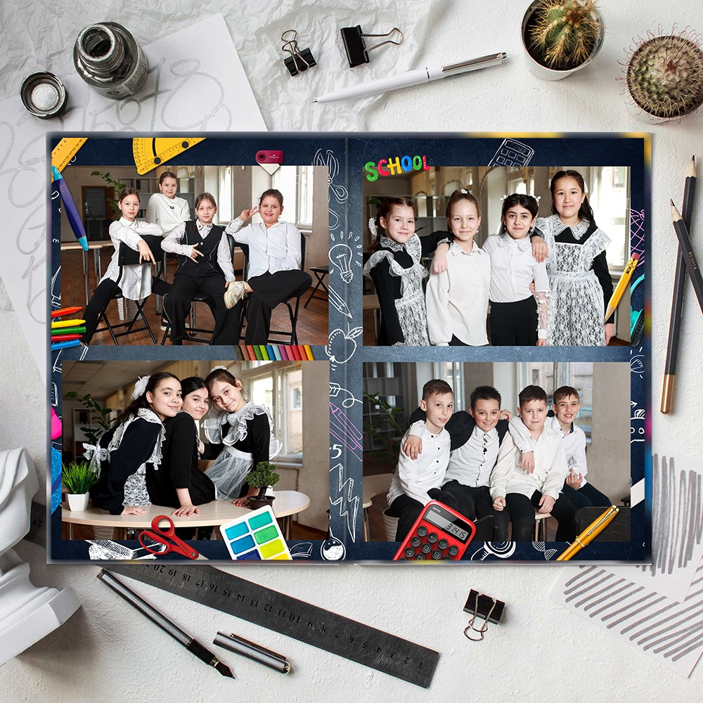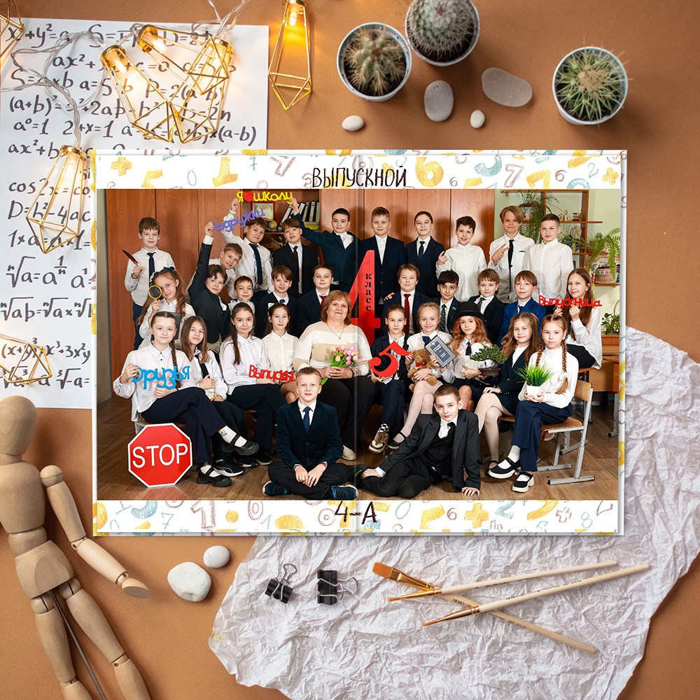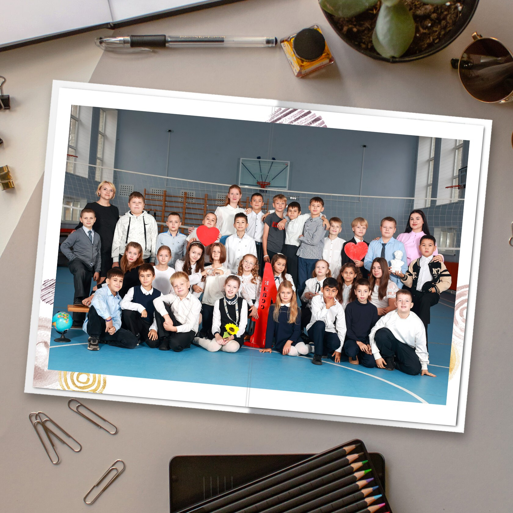 - Альбом ОБЩЕЙ ВЁРСТКИ, с одним персональным портретом для каждого ученика (портрет дублируется в виньетку). Остальное наполнение общее для всего класса