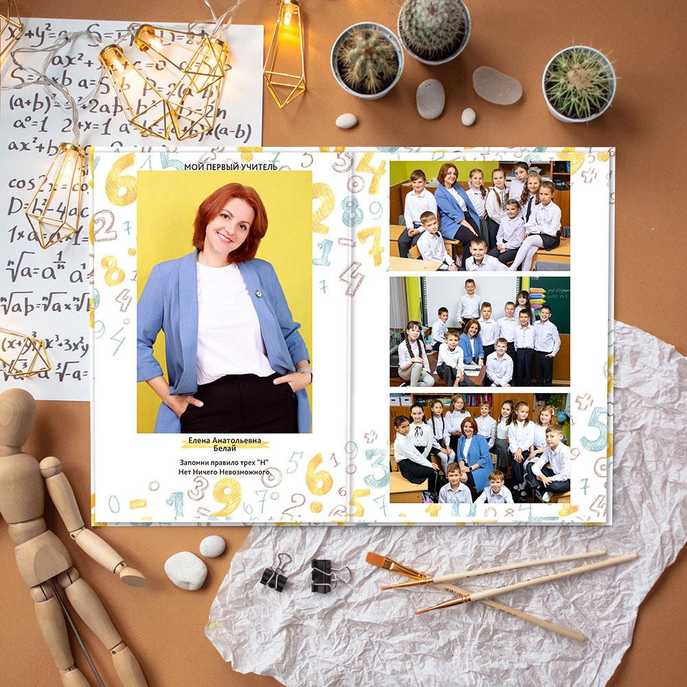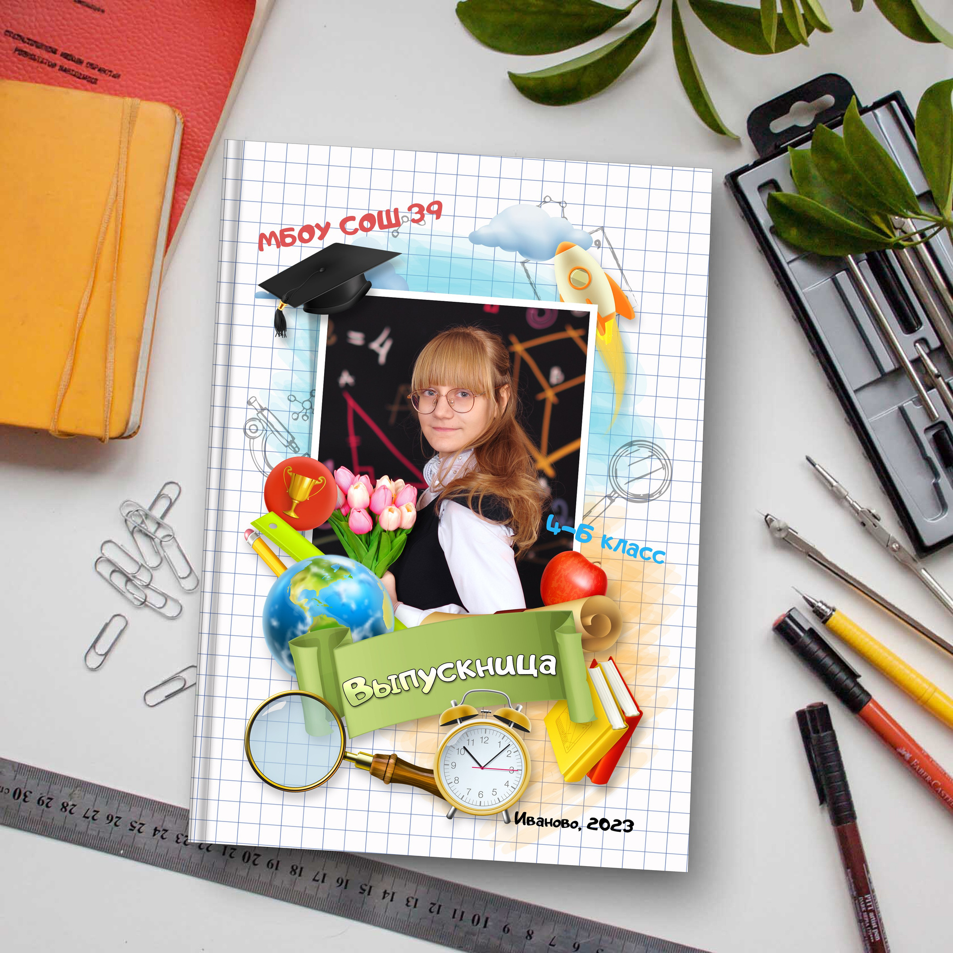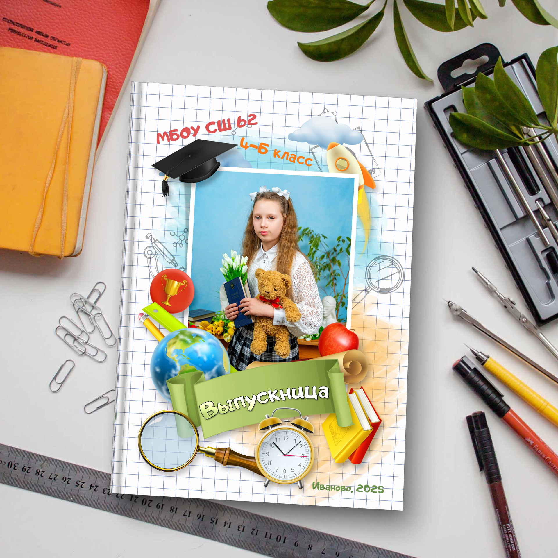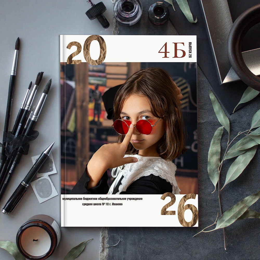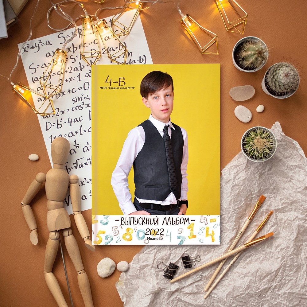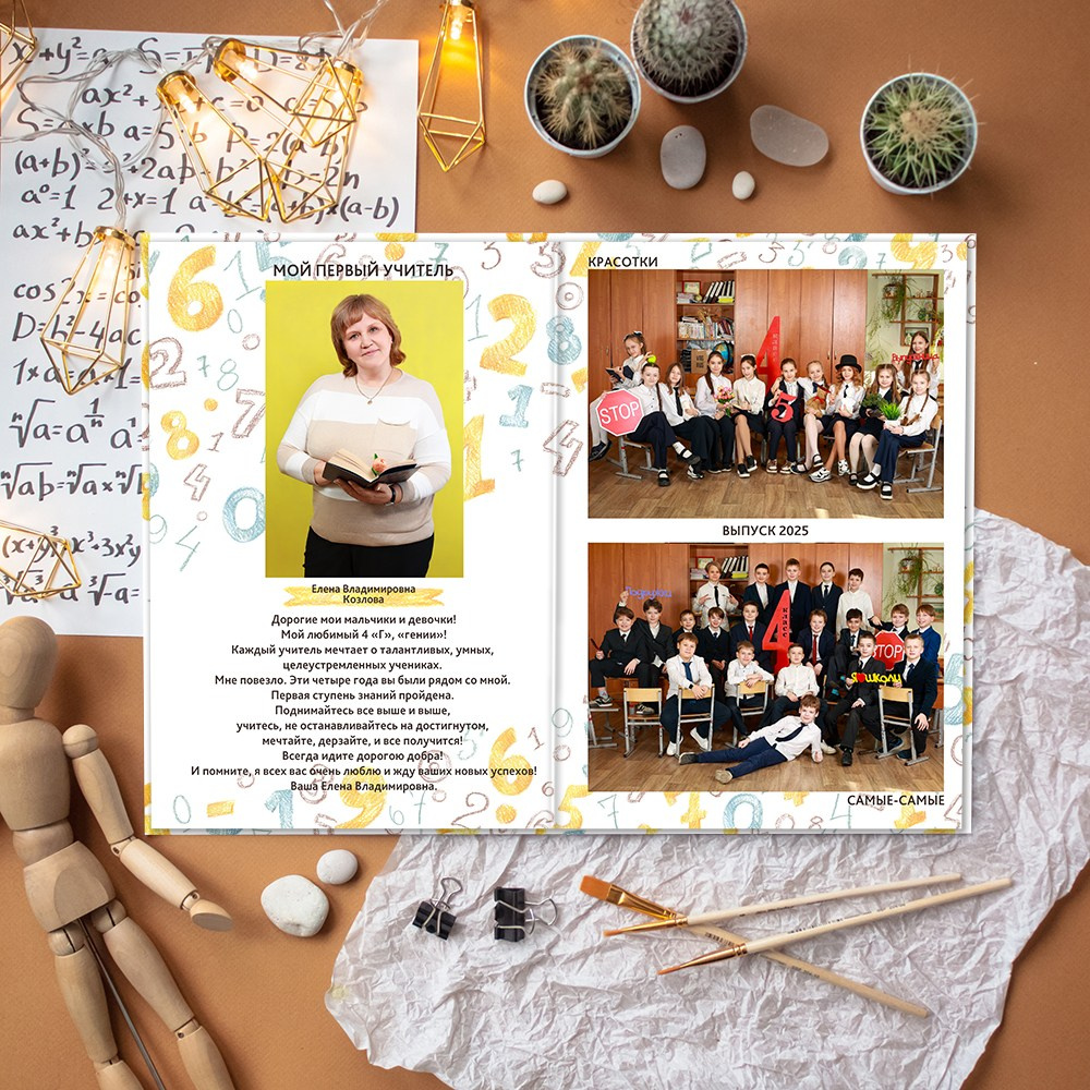 - Альбом ОБЩЕЙ ВЁРСТКИ, с одним персональным портретом для каждого ученика (портрет дублируется в виньетку). Остальное наполнение общее для всего класса