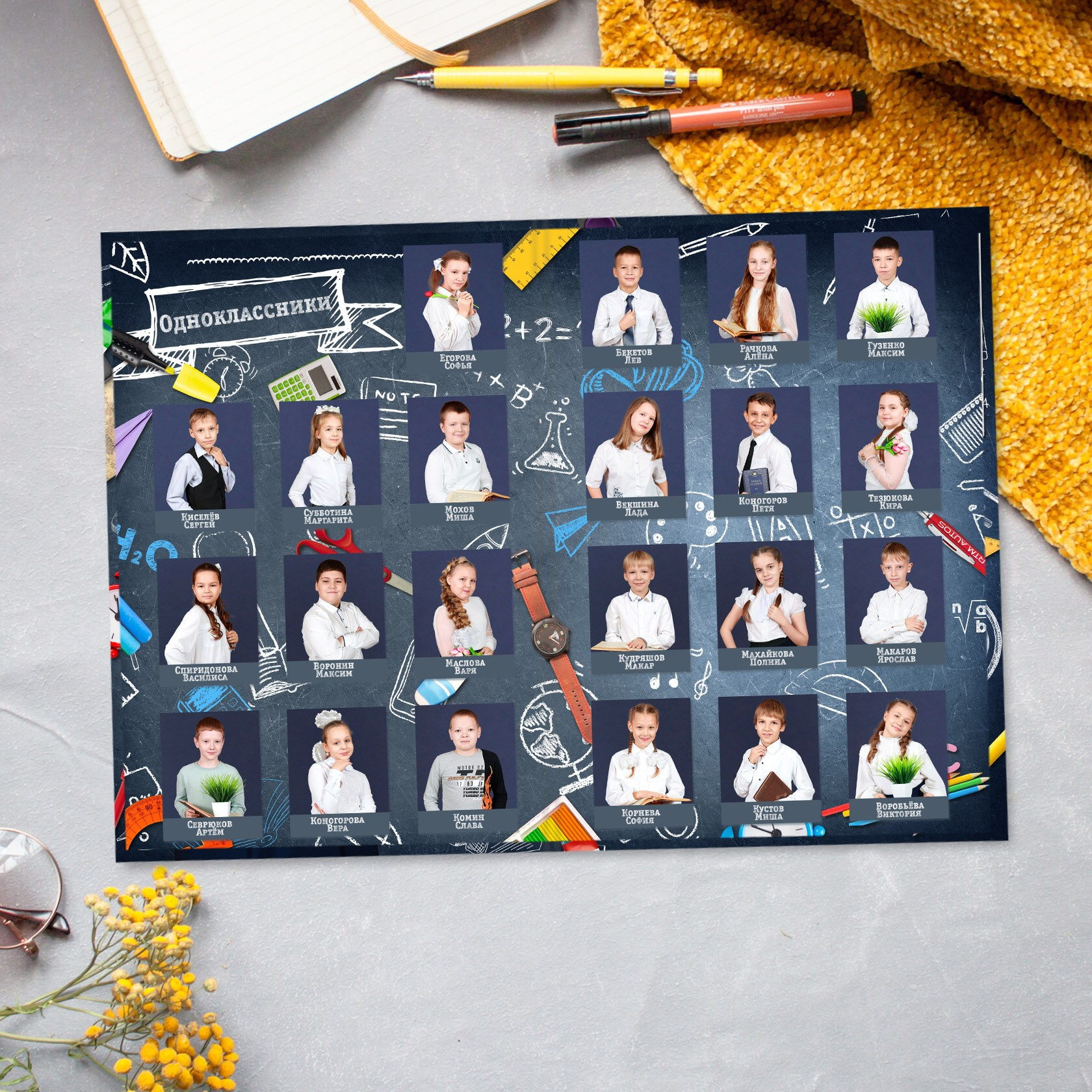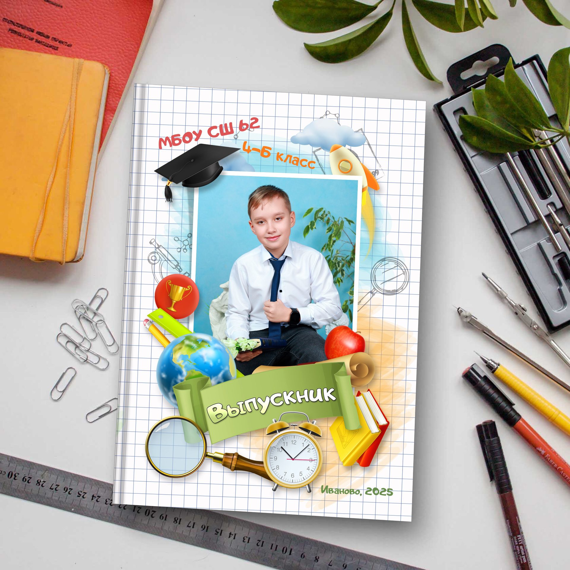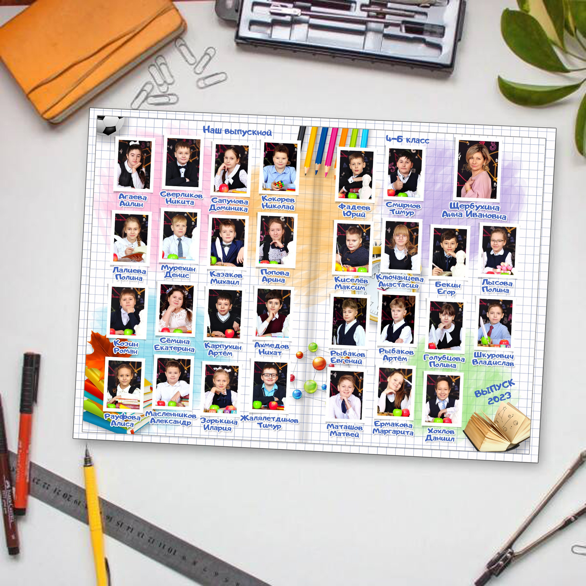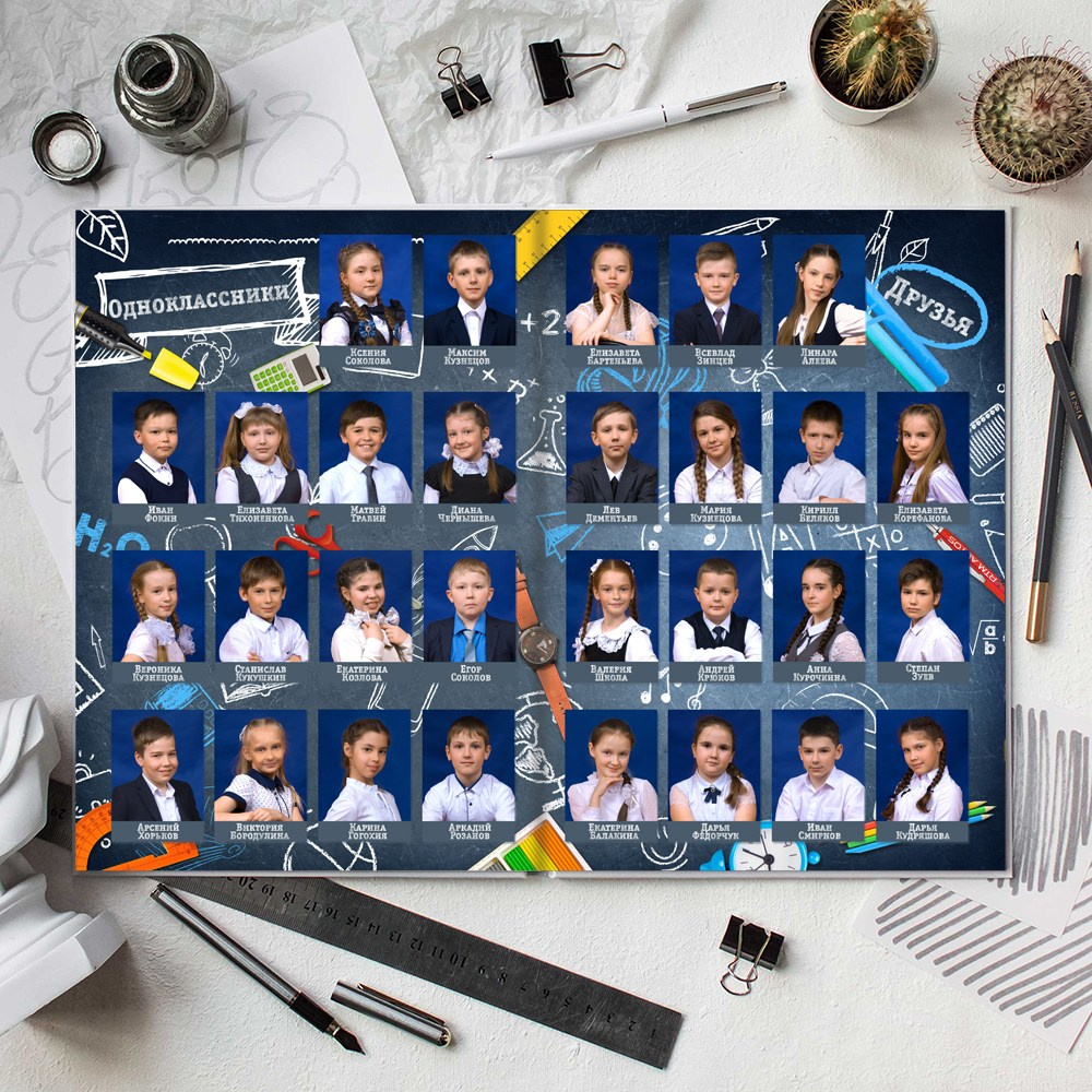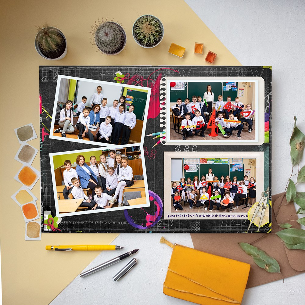 - Альбом ОБЩЕЙ ВЁРСТКИ, с одним персональным портретом для каждого ученика (портрет дублируется в виньетку). Остальное наполнение общее для всего класса