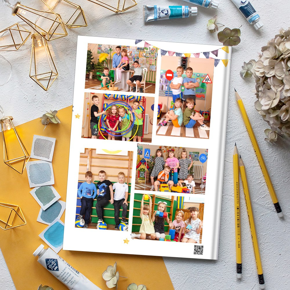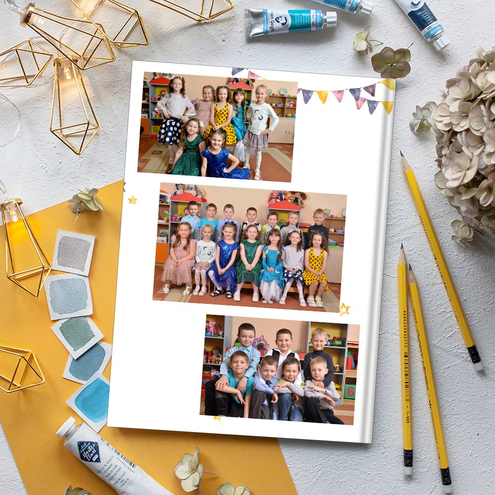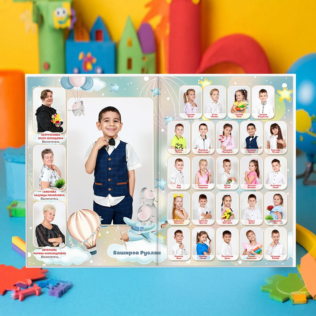 - Дополнительный разворот до 4 групповых фото ребенка только со своими друзьями + 600р