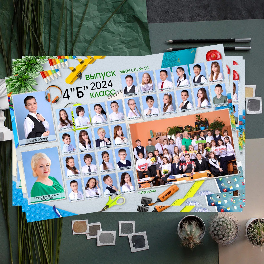 Виньетка (все дети и учитель в окошечках с именами и фамилиями) +дополнительный портрет ученика+общая фотография класса