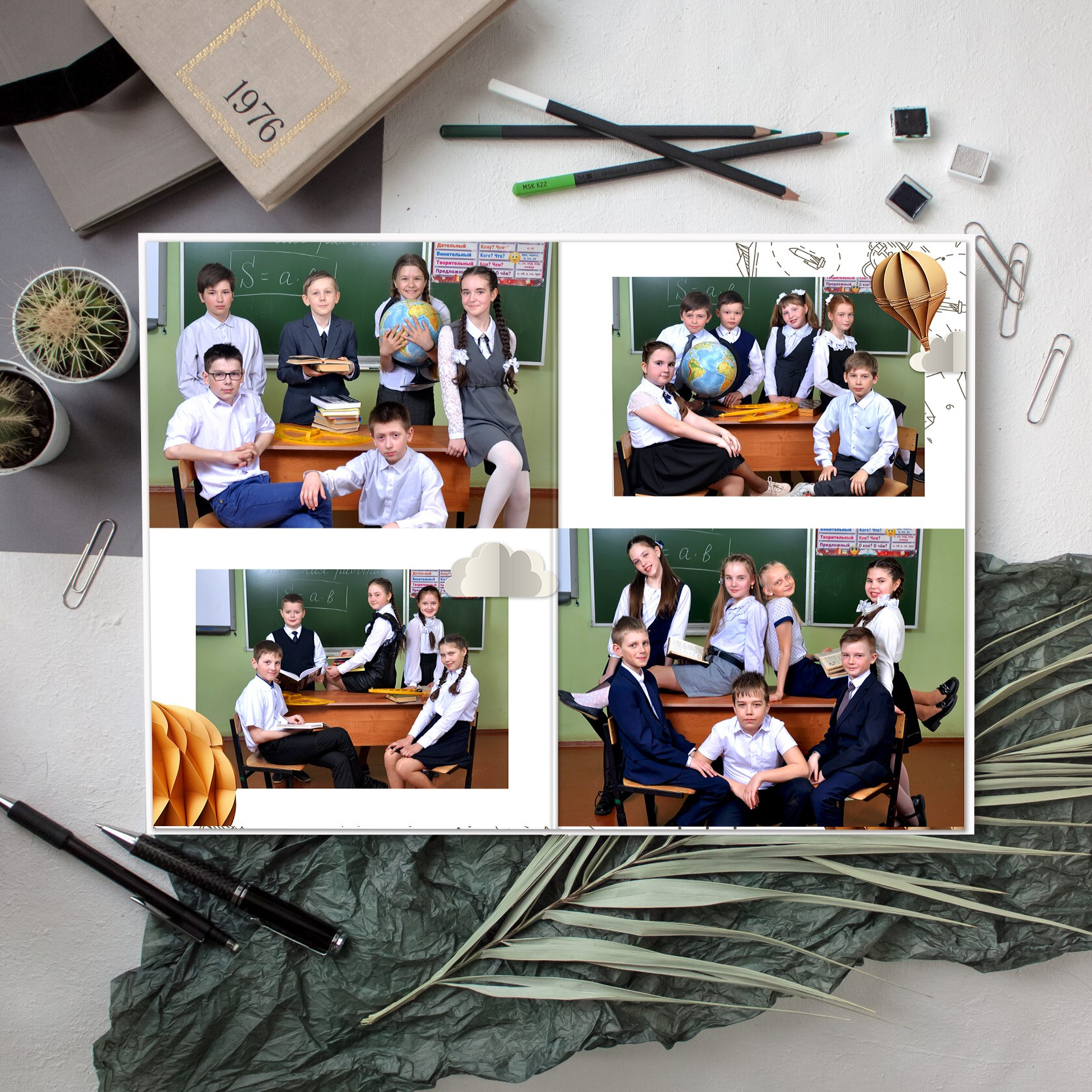 10-18 страницы с мини-группами (6-10шт)Ребенок фотографируется 2-3 раза в составе своей группы (зависит от количества детей вклассе). Все дети на групповых фото одинаковое количество раз.
