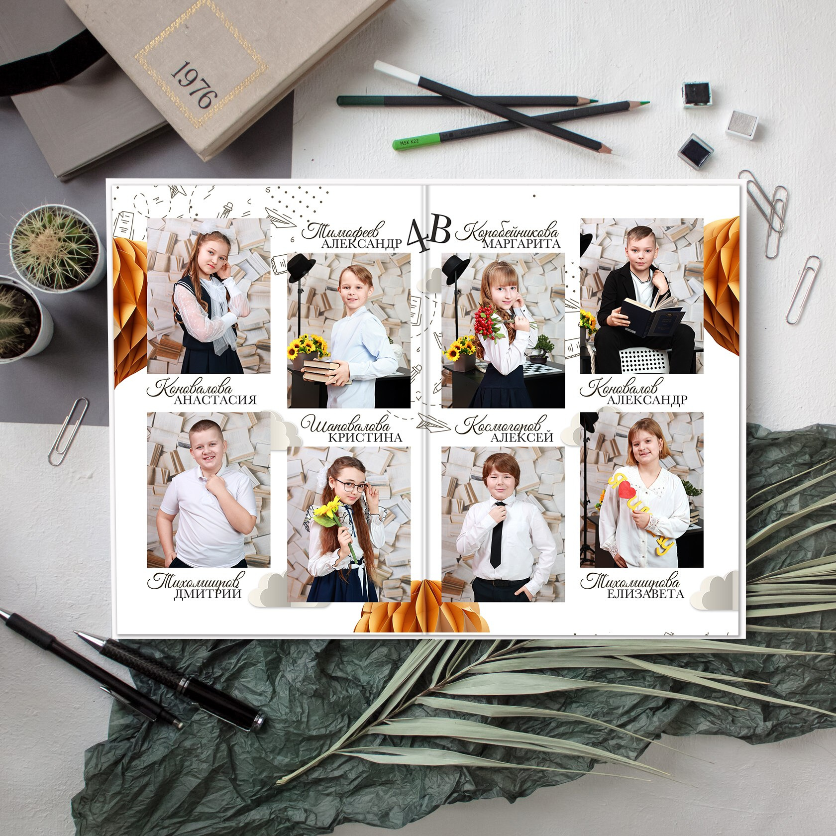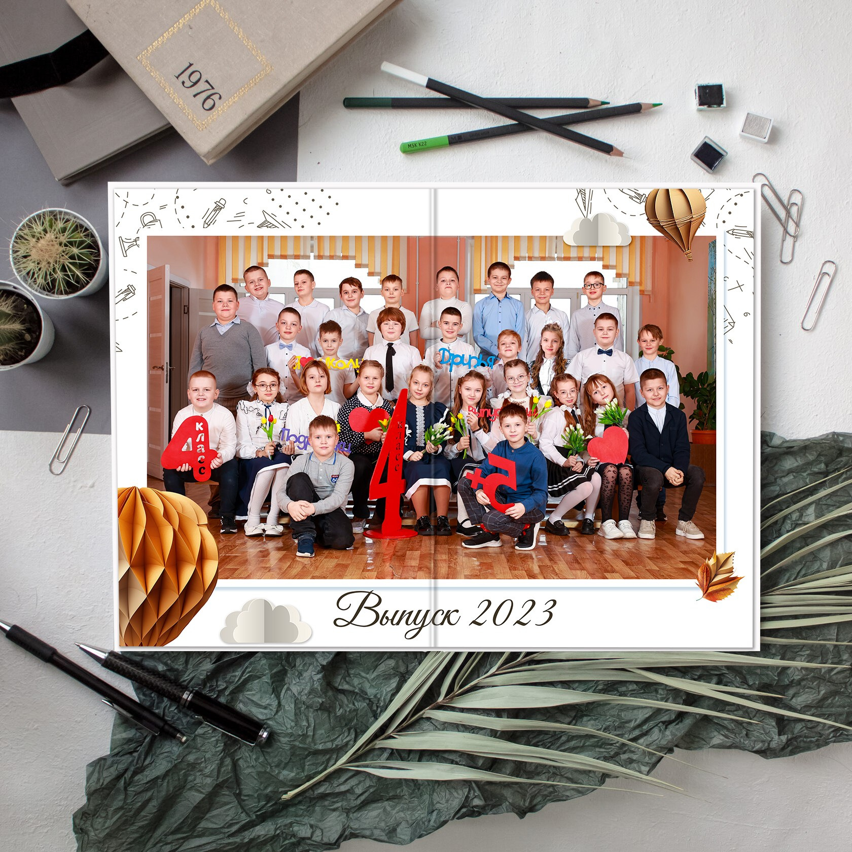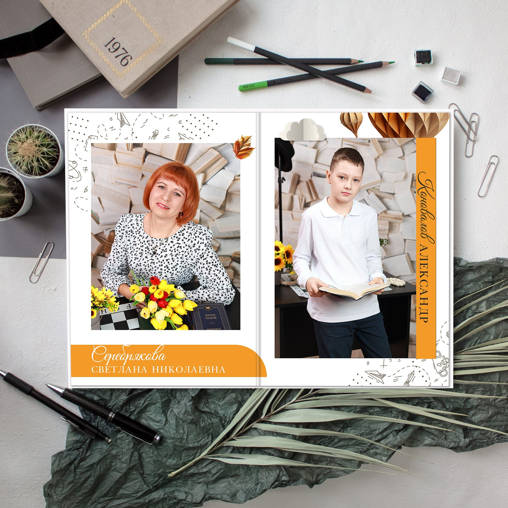 - Индивидуальное фото ребенка на 1 развороте 1 шт + фото учителя (+ по желанию можно добавить напутствие)